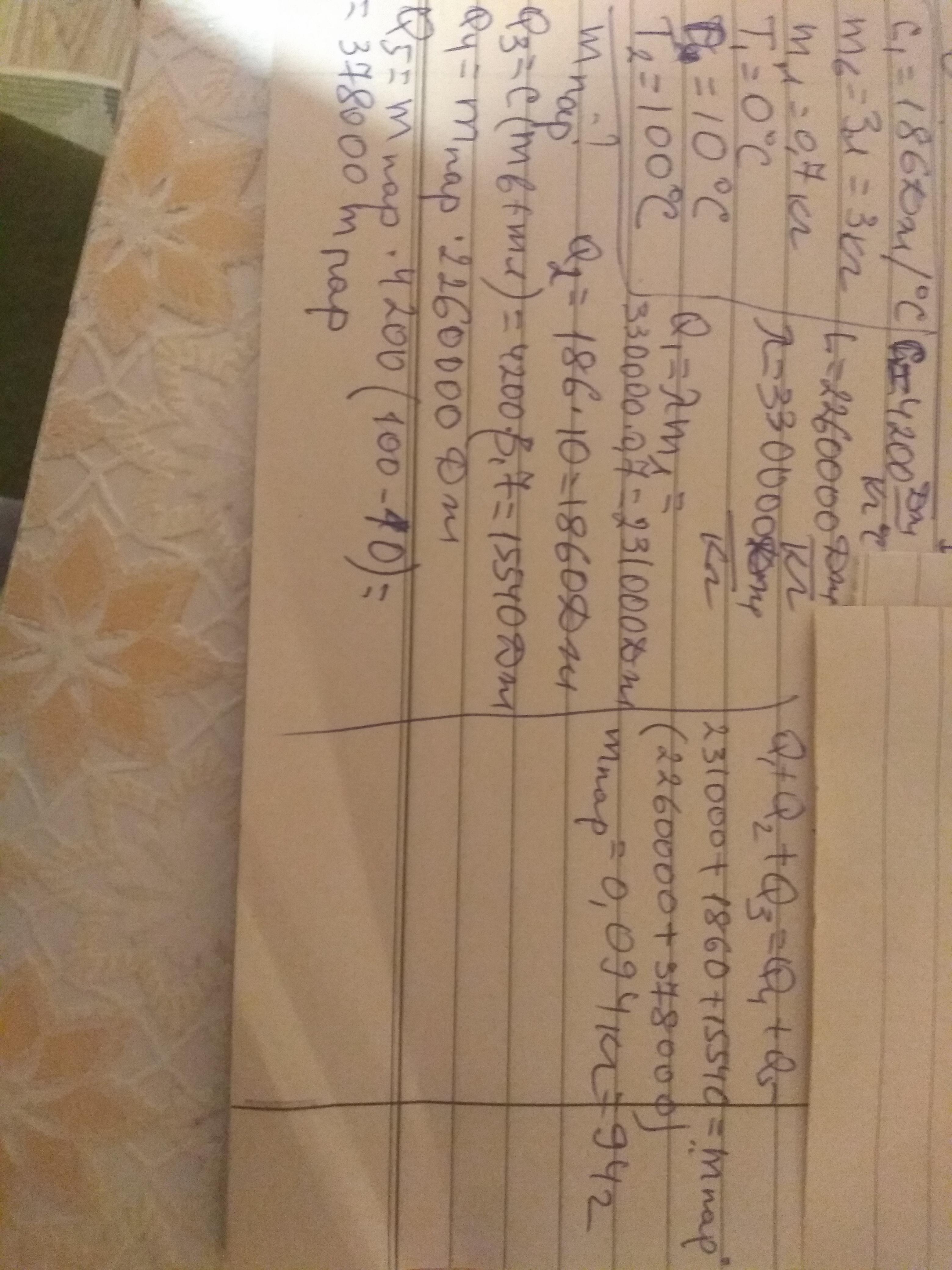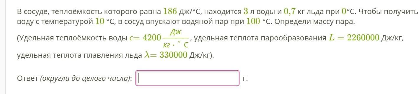В сосуде, теплоёмкость которого равна 186 Дж/°С, находится 3 л воды и 0,7 кг льда при 0°С. Чтобы получить воду с температурой 10 °С, в сосуд впускают водяной пар при 100 °С. Определи массу пара.