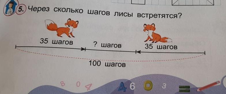 Через 15, так как изначальное расстояние между ними - 100 шагов, они УЖЕ прошли по 35 - это суммарно 70. Осталось ещё 30, лисиц две, следовательно им осталось пройти 30/2=15 шагов