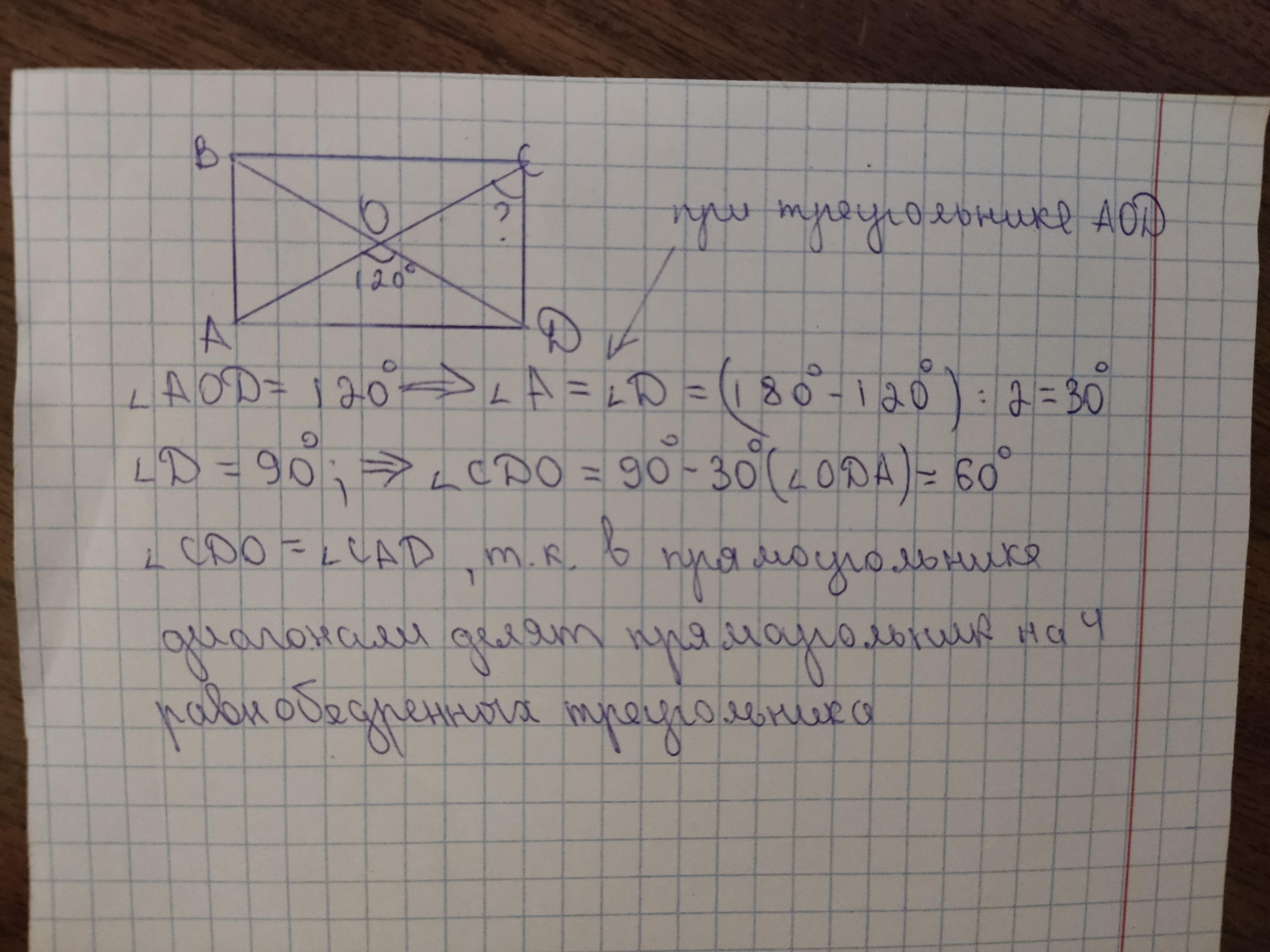 ПЛИИИС У прямокутнику ABCD діагоналі AC і BD перетинаються в точці О, ےAOD=120. Знайдіть ےACD.