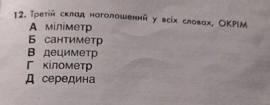 12. Третій склад наголошений у всіх словах, ОКРІМ А міліметр Б сантиметр в дециметр гкілометр д середина