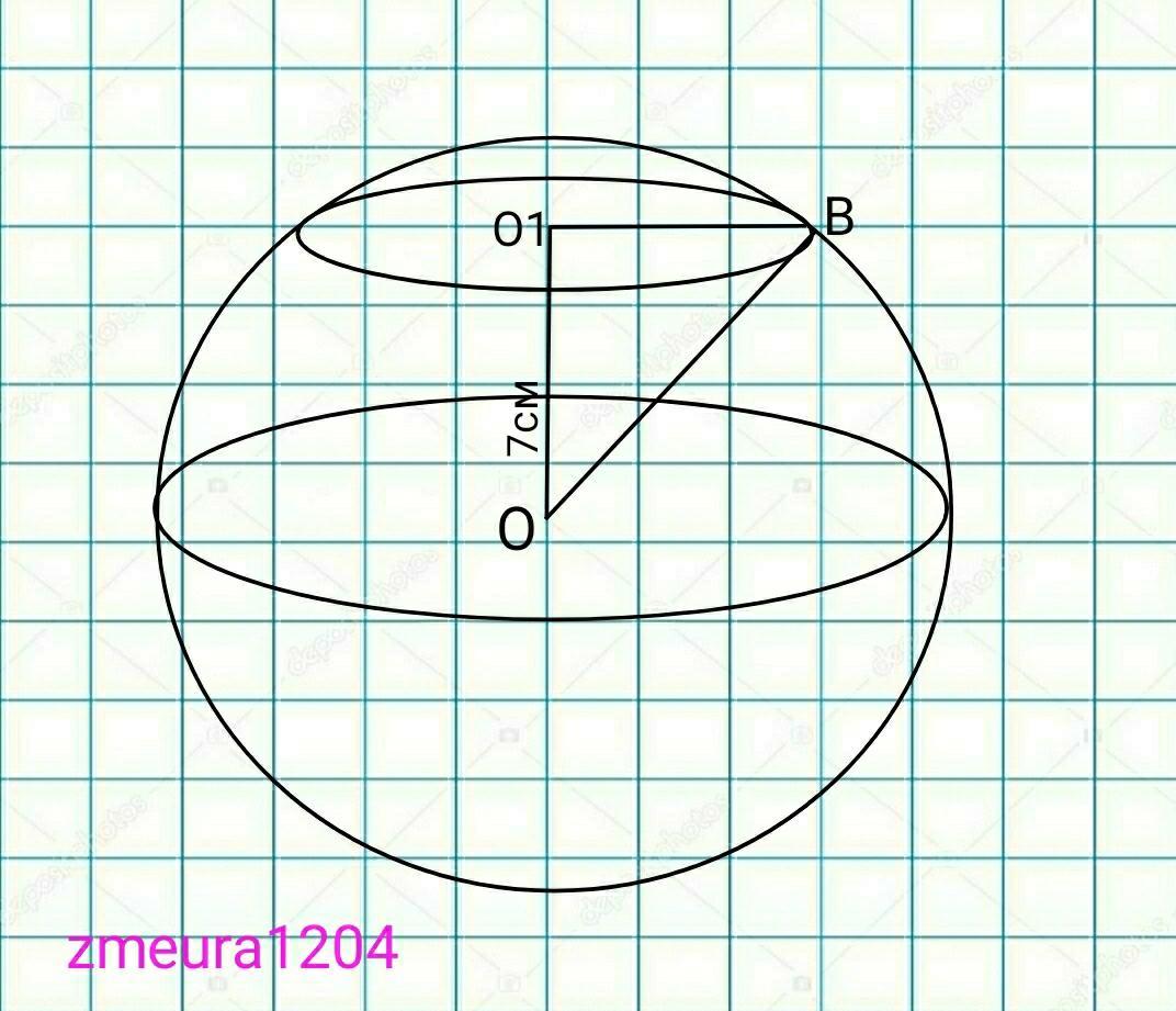 Сферу перетнули площиною на відстані 7см від її центра. Довжина лінії