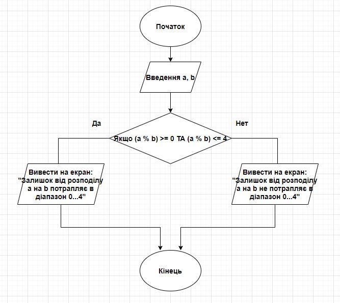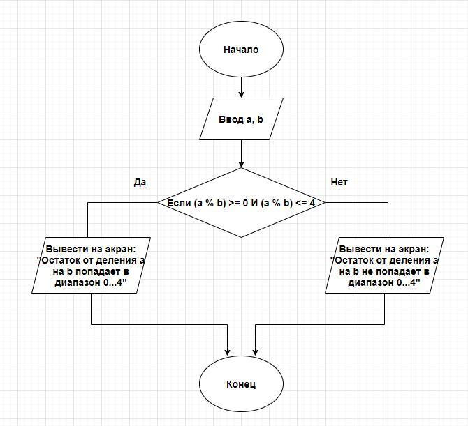 Увести два цілих числа a та b. Знайти залишок від ділення a та b. Визначити належність залишку інтервалу [0...4]. построить блок-схему c++