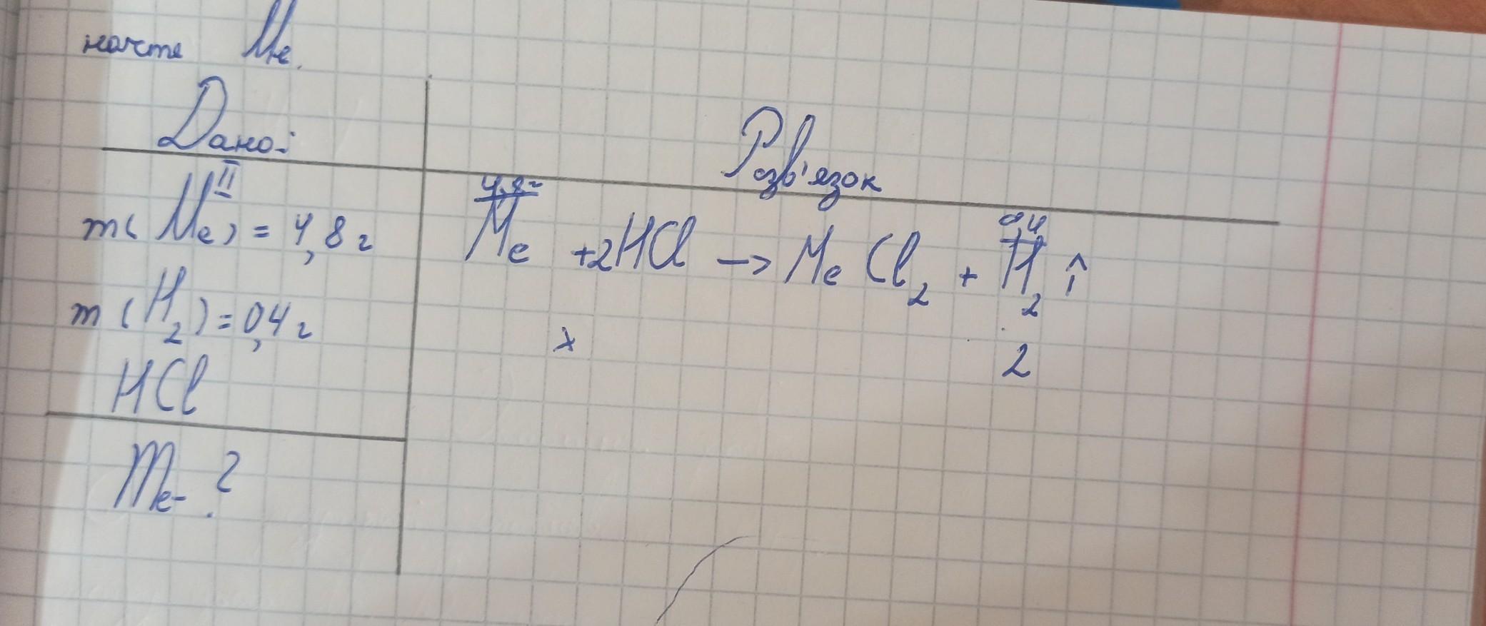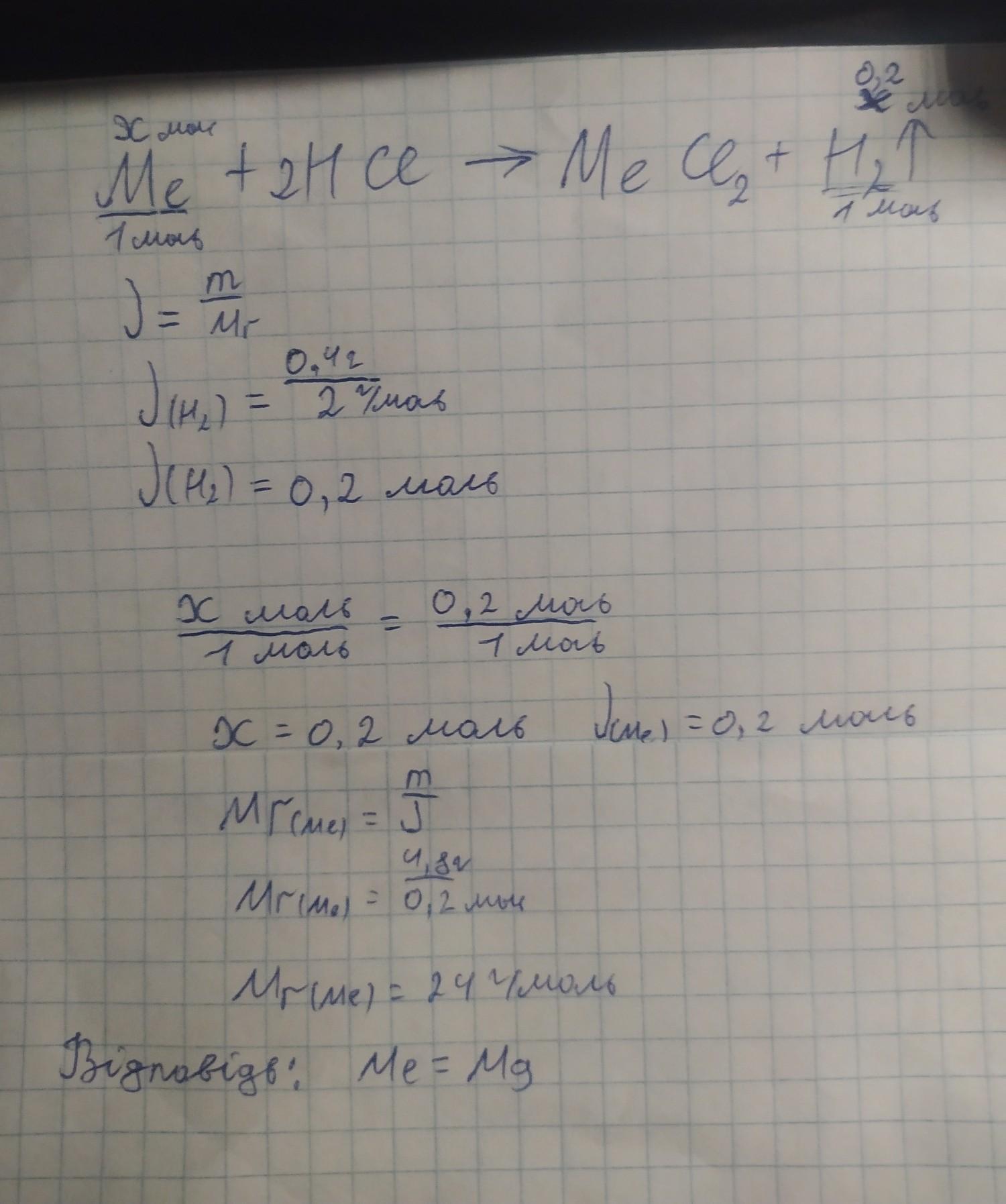 В результаті взаємодії двовалентного металу масою 4,8 гр хлоридною кислотой виділився водень масою 0,4гр. Визначте метал