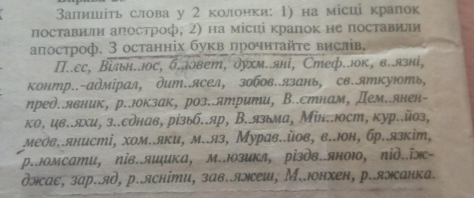 Запишіть слова у 2 колонки: 1) на місці крапок поставили апостроф, 2) на місці крапок не поставили апостроф. З останніх букв прочитайте вислів. П..ес, Вiльн..юс, кет, духм..янi, Стеф..юк, в..язні, контр..-адмірал, дим..ясел, зобов..язань, святкують, пред..явник, р..юкзак, роз..ятрити, В..єтнам, Дем..янен ко, цв..яхи, з..єднав, рiзьб..яр, В..язьма, Мiн..юсм, кур..йоз, меде..янисті, хом..яки, м..яз, Мурав..йов, в..юн, бр..язкiм, р..юмсами, пiв..ящика, м..юзикл, рiздв..яною, під..ïж джає, зар..яд, р..ясніти, зав..яжещ, М..юнхен, р..яжанка.