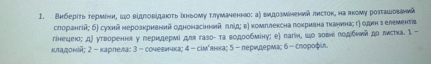 1. Виберіть терміни, що відповідають їхньому тлумаченню: а) видозмінений листок, на якому розташований Спораной; б) сухий нерозкривний однонасінний плід; в) комплексна покривна тканина; г) один з елементів гінецею; д) утворення у перидермі для газо- та водообміну; е) папін, що зовні подібний до листка. 1 - кладоній; 2 — карпела: 3 – сочевичка; 4 – сім'янка; 5- перидерма; 6- спорофіл.