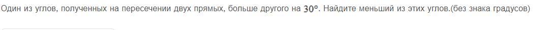 Пусть х-меньший угол, тогда х+30-больший. Т.к при пересечении 2-х прямых получаются 2 пары равных углов и 2 пары смежных углов, то x+x+30=180