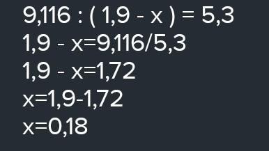 Выполнив задание, в ответ запишите только число или числа. Если ответ содержит несколько чисел, разделяйте их точкой с запятой (;) не используя пробел, записывайте числа в порядке возрастания. Если ответом является обыкновенная дробь, то переведите ее в десятичную дробь и запишите в ответ десятичную дробь. Решите уравнение 9,116 : ( 1,9 - х ) = 5,3.