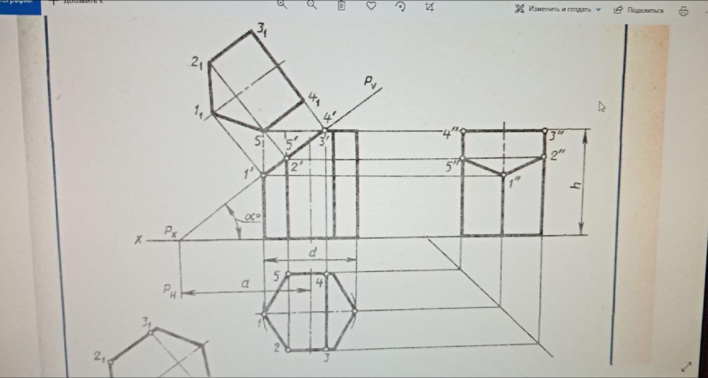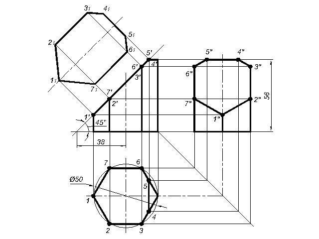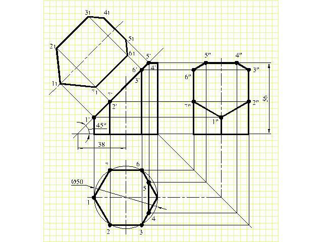 Выполнить чертеж усеченной призмы. Найти действительную величину контура сечения. d50 h56 a 38 a' 45