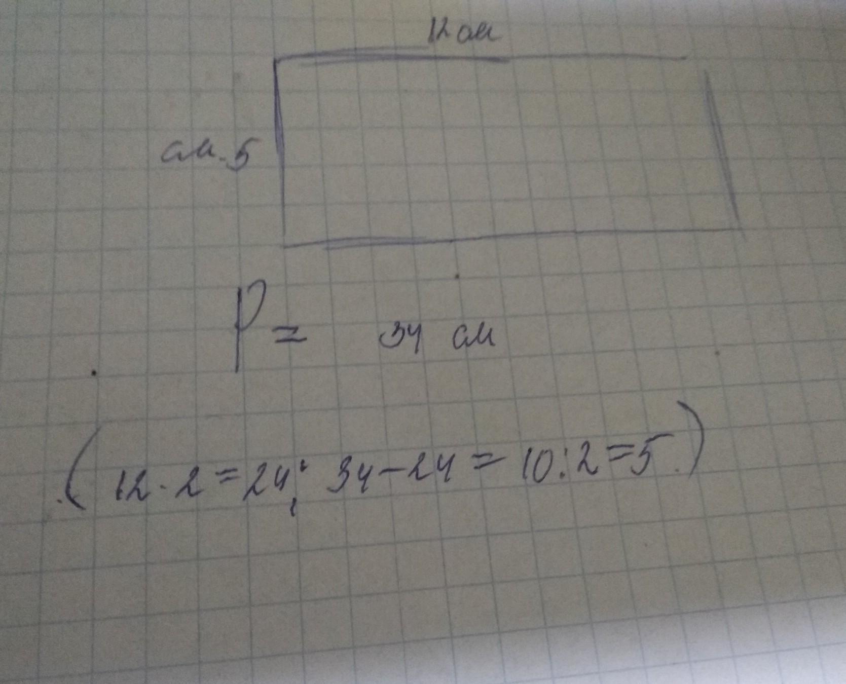 Периметр прямоугольника равен 34 см а одна из его сторон 12 см Найди длину соседние стороны прямоугольника (с чертежом)