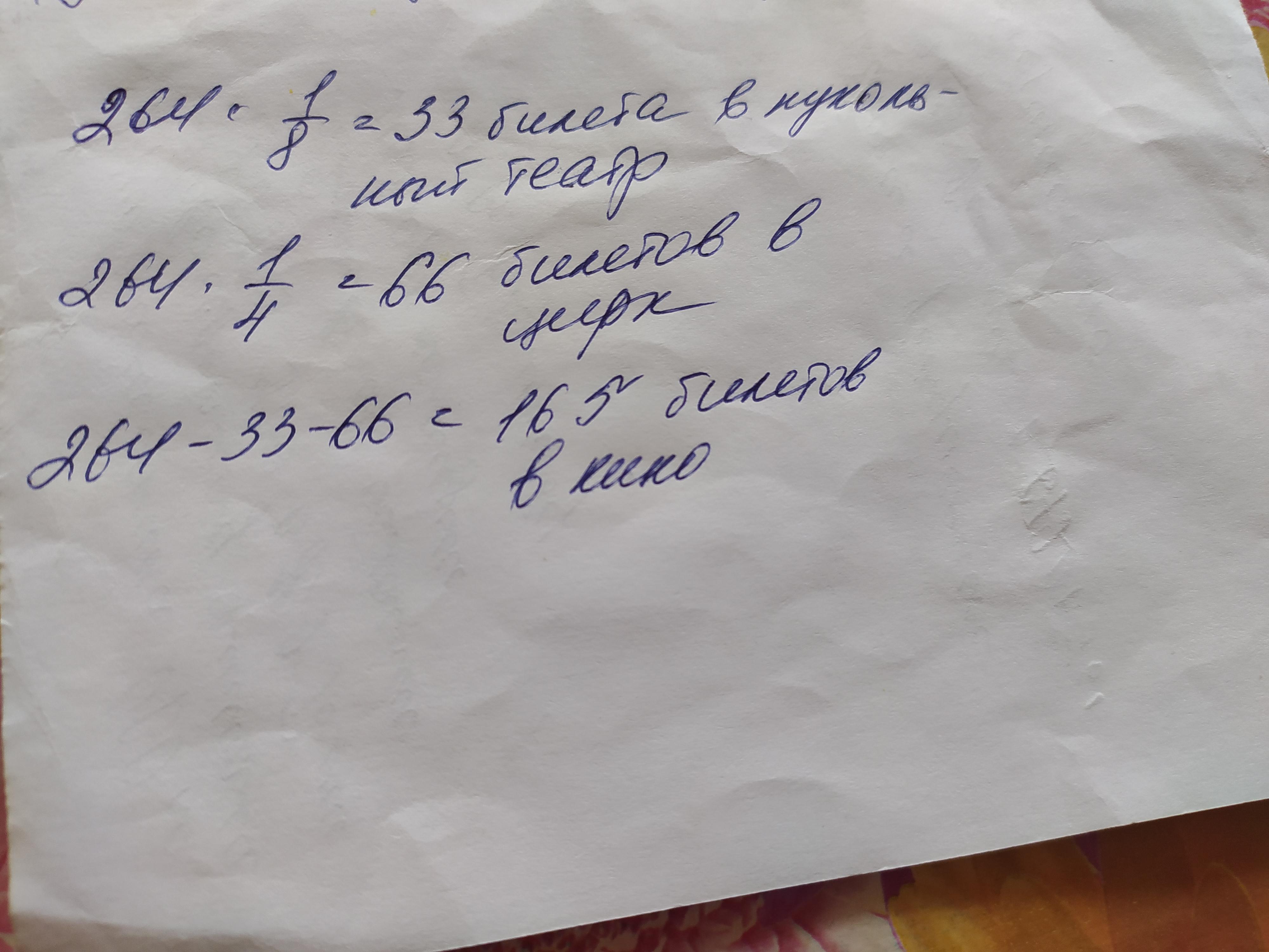 Для молодших школярів придбали всього 264 квитків: 1/8 всіх квитків - у ляльковий театр, у цирк - 1/4 всіх квитків, а всі інші - у кінотеатр. Скільки придбали квитків у кінотеатр.