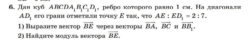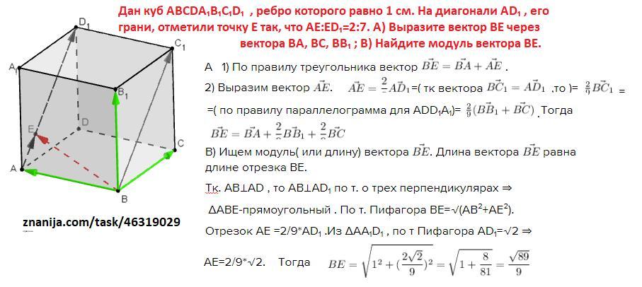 Дан куб АВСDA₁B₁C₁D₁ , ребро которого равно 1 см. На диагонали АD₁ , его грани, отметили точку Е так, что АЕ:ЕD₁=2:7. A) Выразите вектор ВЕ через вектора ВА, ВС, ВВ₁ ; B) Найдите модуль вектора ВЕ.