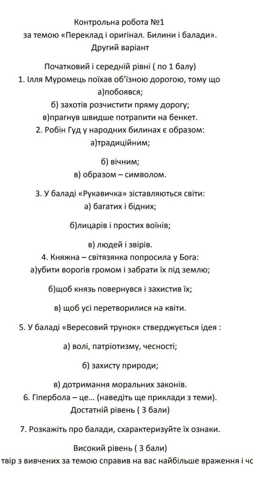 7.Балада — невеликий за розміром ліро-епічний твір фольклорного походження на легендарну чи історичну тему. У ньому, як правило, розповідається про щось незвичайне, виняткове, героїчне; реальне часто поєднується з фантастичним.