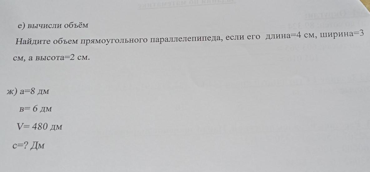 е) вычисли объём Найдите объем прямоугольного параллелепипеда, если его длина=4 см, ширина=3 см, а высота=2 см. ж) a=8 дм в= 6 дм V= 480 дм c=? Дм