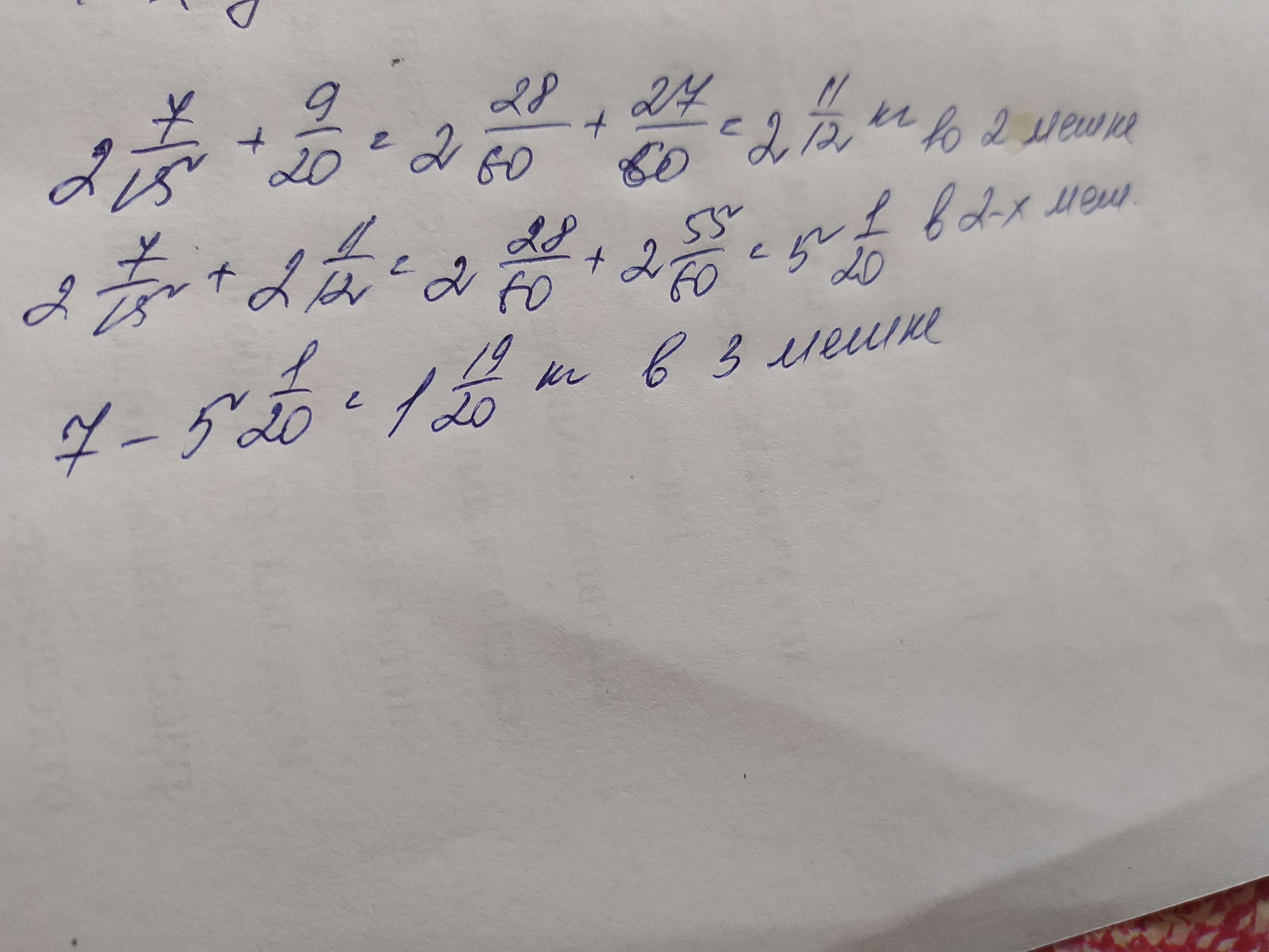 В трьох мішках 7 кг крупи . У першому пакеті 2 7/15 кг. А в другому на 9/20 кг більше ніж у першому.