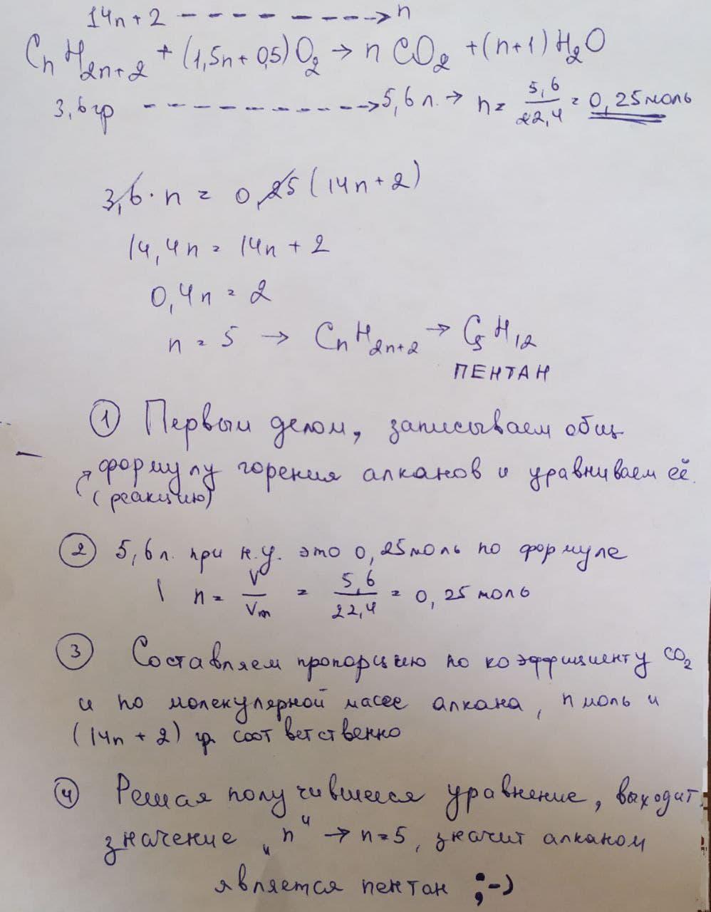 При сгорании алкана массой 3,6 г образуется оксид углерода (IV)объемом 5,6 л (нормальные условия).Какой объем кислорода,приведенный к нормальным условиям,потребуется для реакции?