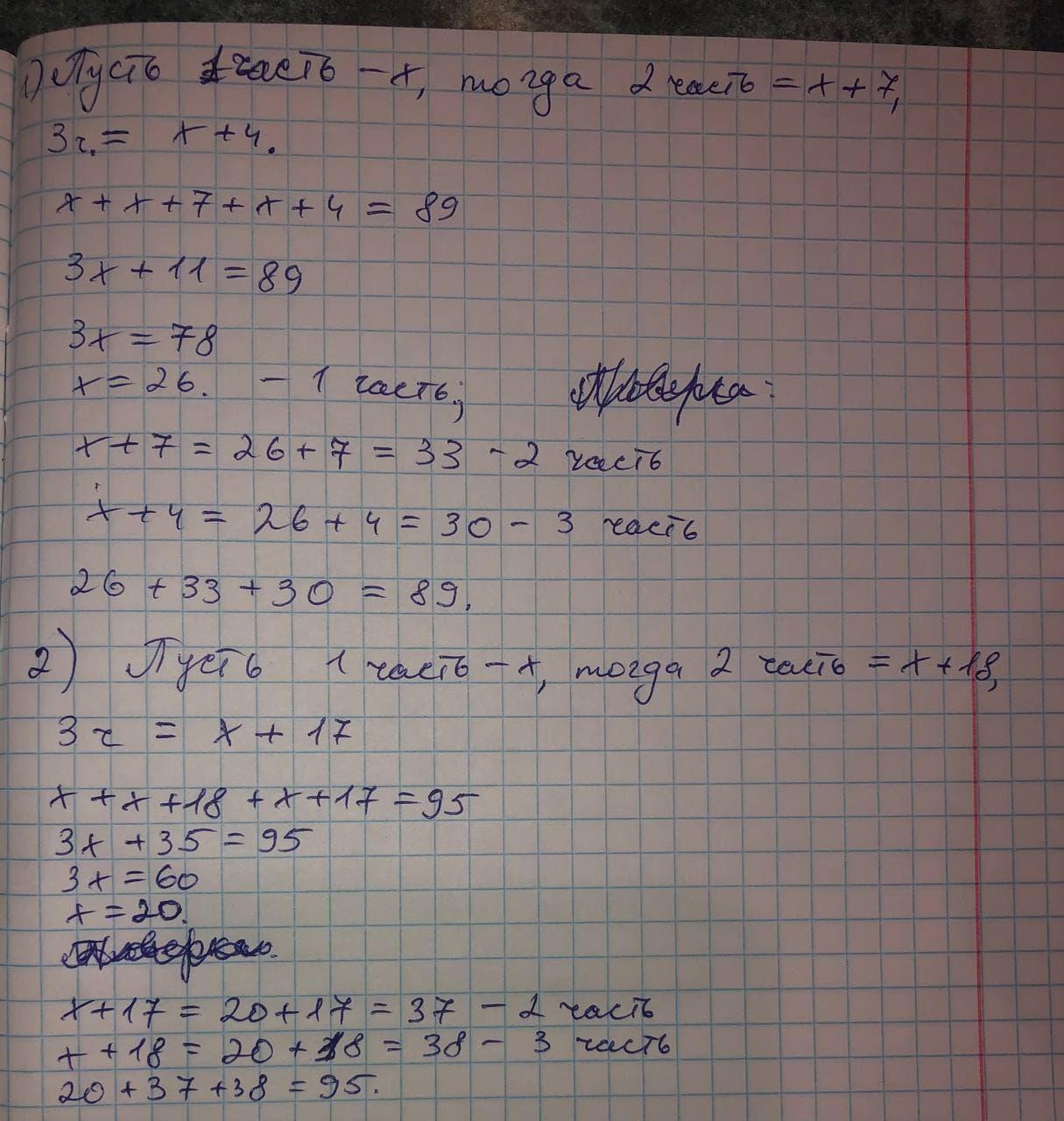 1)Разделите 89 на 3 так, что бы 2 часть была больше 1 на 7, а 3 часть больше 1 части на 4 2)разделите 95 на 3 части так, что бы 2 часть была больше 1 на 18, а 3 была больше 1 части на 17 3)разделить 800 на такие три части, что бы 1 часть была 88 больше 2 части, а 3 часть равнялась сумме двух первых