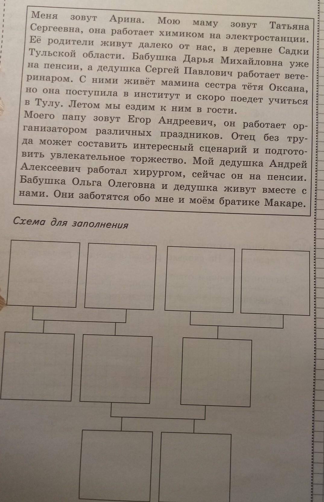 Меня зовут Арина. Мою маму зовут Татьяна Сергеевна, она работает химиком на электростанции. Её родители живут далеко от нас, в деревне Садки Тульской области. Бабушка Дарья Михайловна уже на пенсии, а дедушка Сергей Павлович работает вете- ринаром. С ними живёт мамина сестра тётя Оксана, но она поступила в институт и скоро поедет учиться в Тулу. Летом мы ездим к ним в гости. Моего папу зовут Егор Андреевич, он работает ор- ганизатором различных праздников. Отец без тру- да может составить интересный сценарий и подгото- вить увлекательное торжество. Мой дедушка Андрей Алексеевич работал хирургом, сейчас он на пенсии. Бабушка Ольга Олеговна и дедушка живут вместе с нами. Они заботятся обо мне и моём братике Макаре. Схема для заполнения