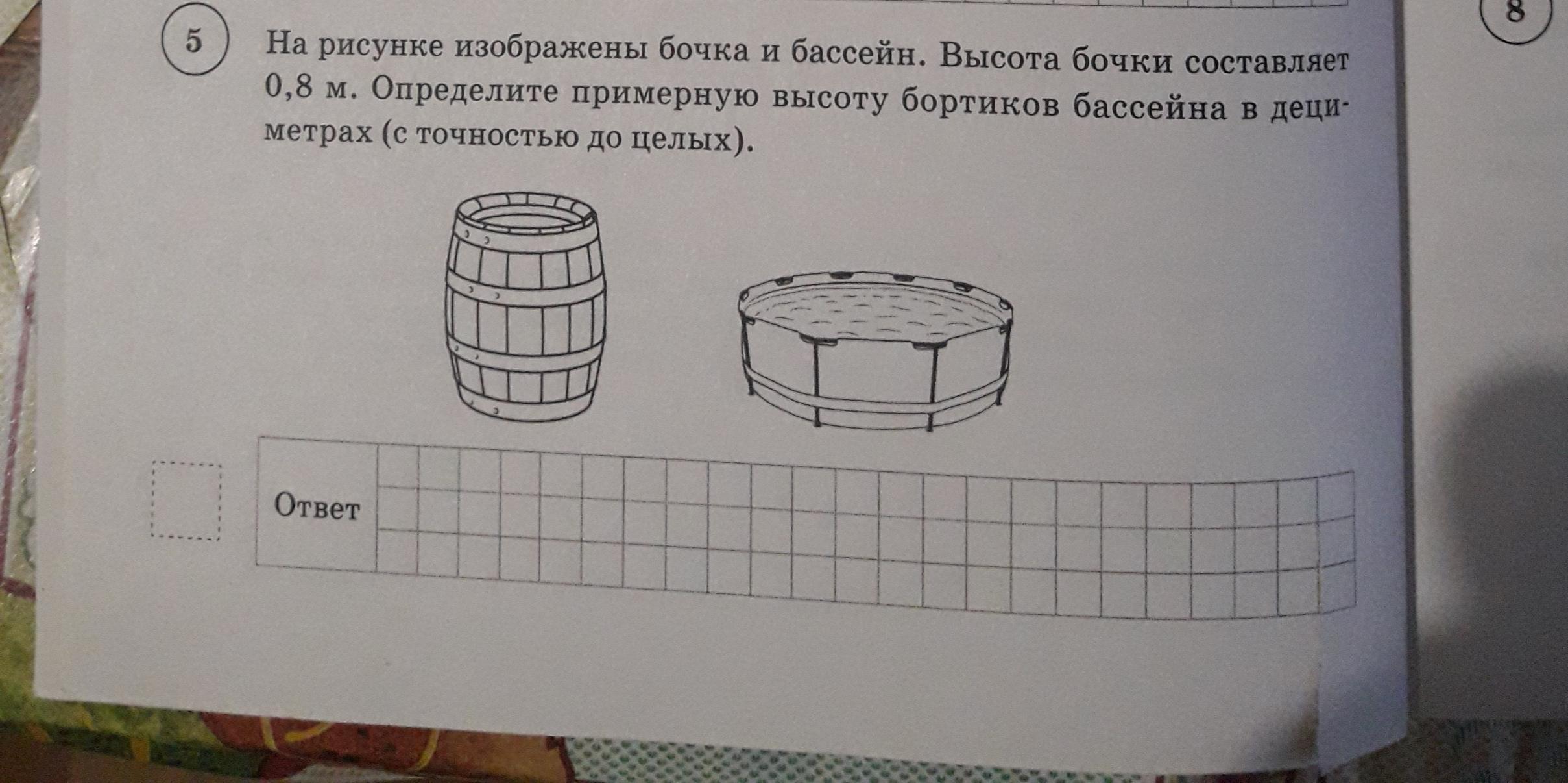 высота бассейна в два раза меньше высоты бочки (если померить), Высота бочки =0,8м=8дм, значит Н бассейна 8/2=4 дм