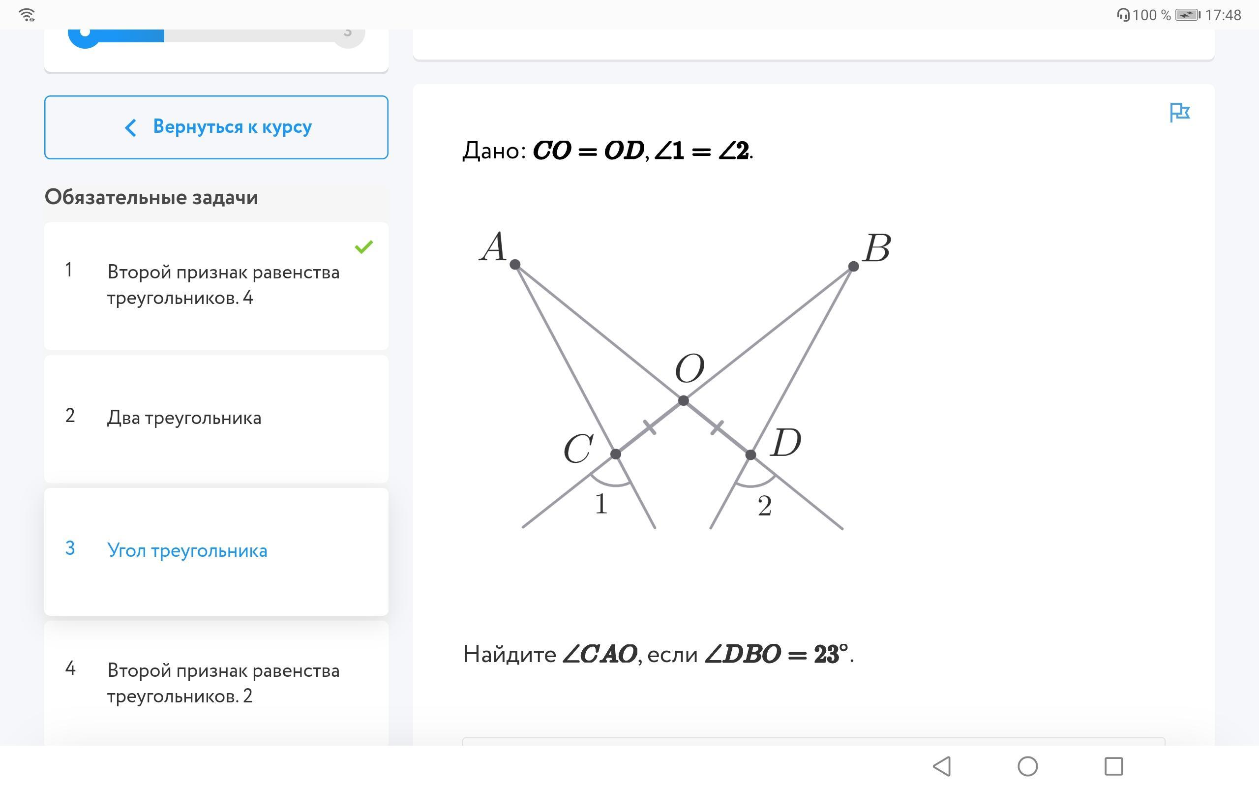 Значит Угол САО = Углу DBO (т. к известен Угол DBO, то мы с лёгкостью можем найти Угол CAO.)