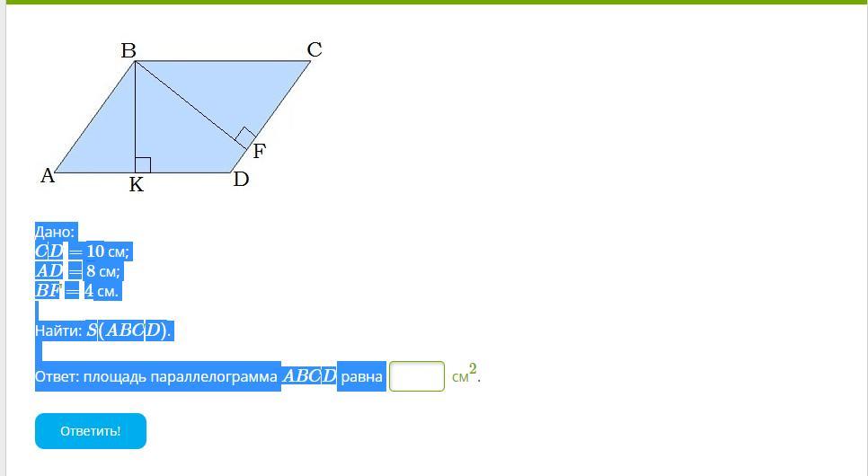 Площадь параллелограмма равна произведению стороны параллелограмма и высоты,опущенной на эту сторону