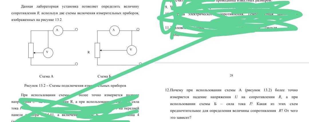 если измеряемое сопротивление велико и сопротивление вольтметра не сильно отличается от сопротивления резистора то схема А даст большое искажение со стороны вольтметра. и тогда предпочтительнее схема В