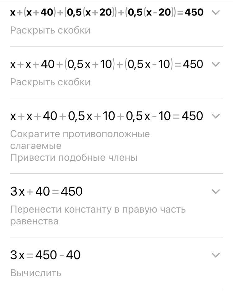 X + (x + 40) + (0,5*(x+20) +(0,5*(x - 20) = 450