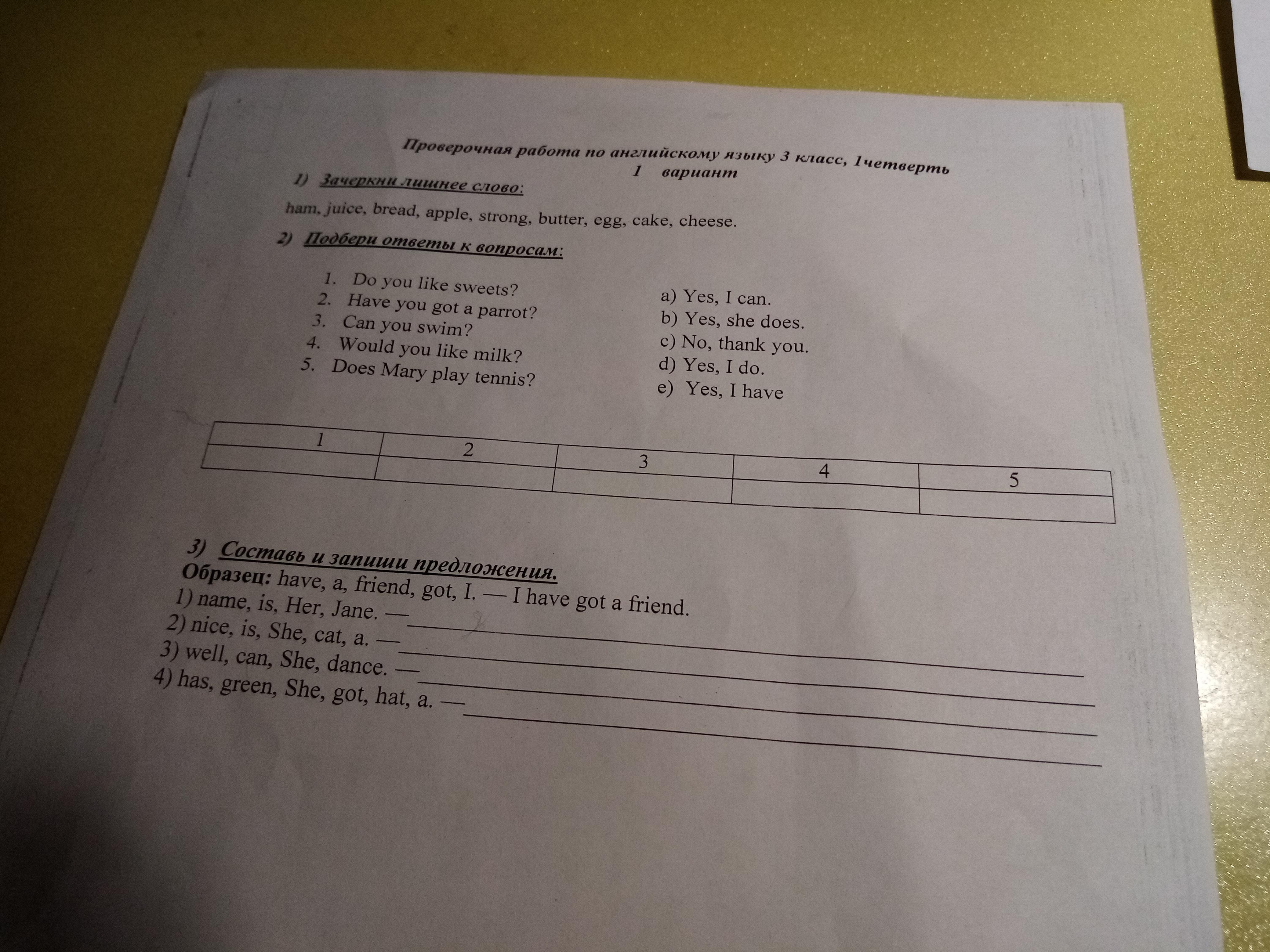 1)лишнее слово это strong . 2) 1-d, 2-e, 3-a, 4-c, 5-b. 3) 1. Her name is Jane 2. She is nice a cat . 3.She can well dance .4. She has got a hat green