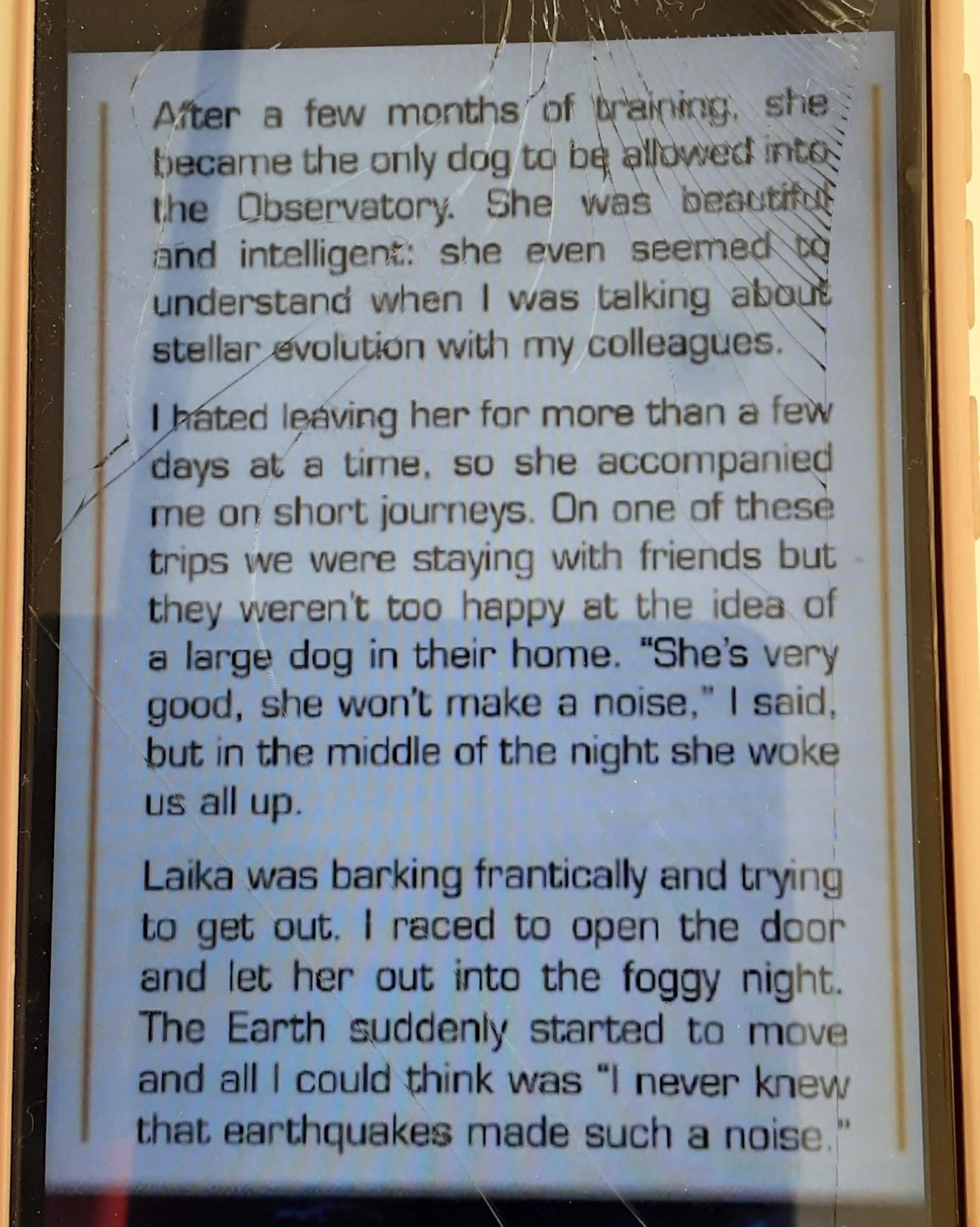 Після кількох місяців роздумів вона стала єдиною собакою, яку допустили до обсерваторії. Вона була красивою та розумною: вона навіть, здавалося, розуміла, коли я говорив зі своїми колегами про зоряну еволюцію. Я ненавидів залишати її більше ніж на кілька днів, тому вона супроводжувала мене в коротких подорожах. Під час однієї з таких поїздок ми зупинялися у друзів, але вони не були дуже задоволені ідеєю великої собаки в їхньому домі. «Вона дуже добра, не буде шуміти», — сказав я, але серед ночі вона нас усіх розбудила. Лайка несамовито гавкала й намагалася вибратися. Я кинувся відкривати двері й випустити її в туманну ніч. Земля раптом почала рухатися, і все, що я міг подумати, це «Я ніколи не знав, що землетруси створюють такий шум».