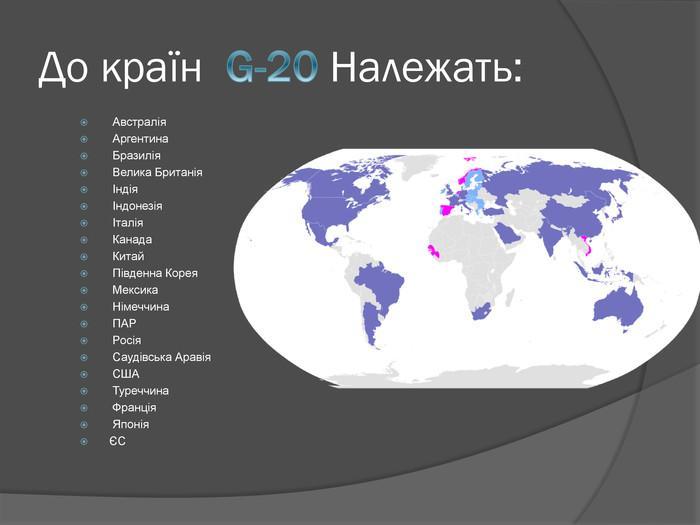 6. Яка із наведених країн не входить до “Великої двадцятки??? A) Нова Зеландія В) Індонезія Б) Південна Африка Г) Туреччина