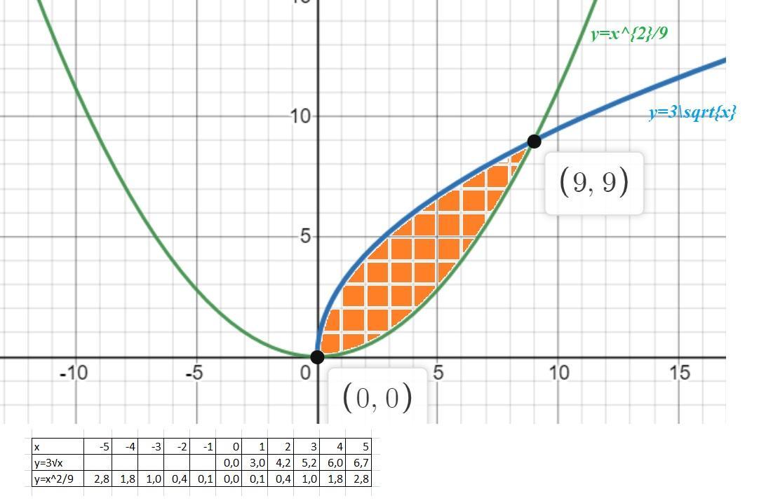 S=∫₀⁹(3√x-x^2/9)dx=(3 *2/3x^(3/2) -1/9 *x^3/3)|₀⁹=