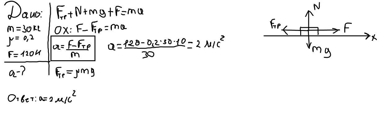 На горизонтальной поверхности лежит коробка массой 30 кг. Коэффициент трения между коробкой и поверхностью равен 0,2. С каким ускорением начнет двигаться коробка, если к ней приложить горизонтальную силу 120 Н?
