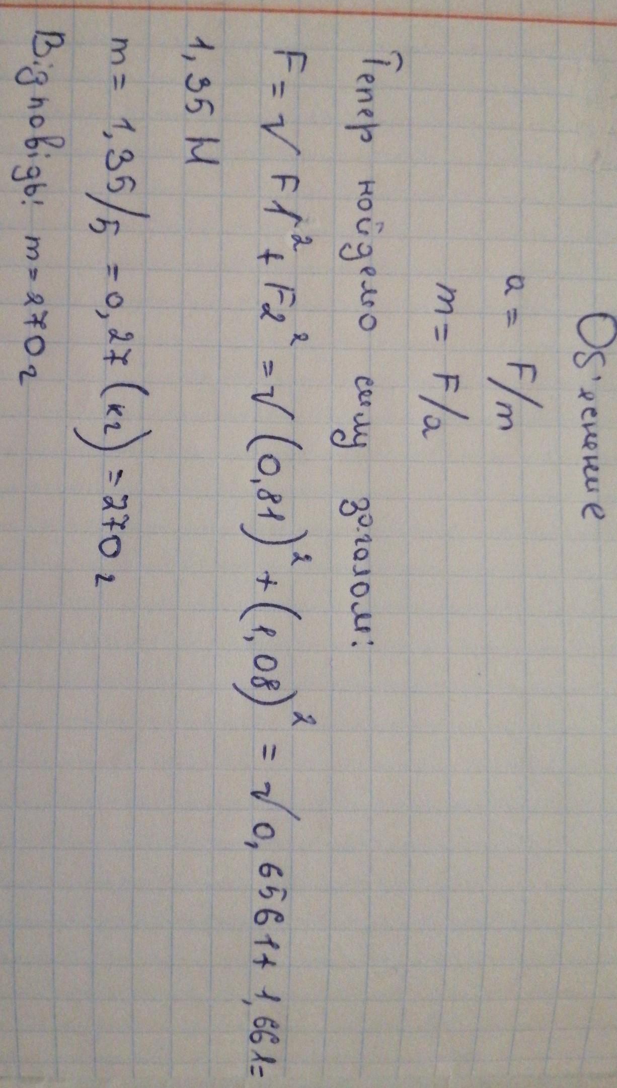 Більярдна куля під дією двох взаємно перпендикулярних сил 0.81 і 1.08 Н набуває прискорення 5м/с²визначте масу кулі
