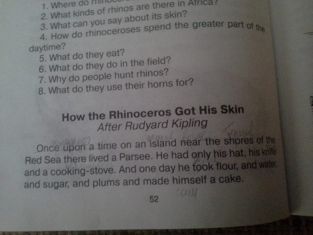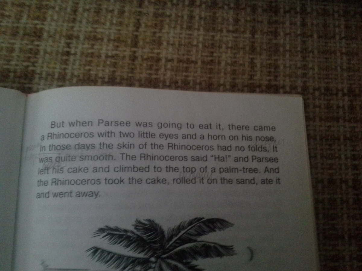 однажды на острове возле берегов красного моря жил парси у него была только шляпа,его нож, и кухонная печь.однажды он взял муку,воду,сахар и сливы и сделал себе пирог.но когда он собрался съесть его,пришел носорог с 2маленькими глазками и рогом на его носу.за эти дни кожа у него не слазила и была гладкой. Носорог сказал:"Ха" парси оставил свой пирог и залез на пальму а носорог скатил пирог на песок съел его и ушел прочь...(3часть плохо видно,сделай другую фотографию)