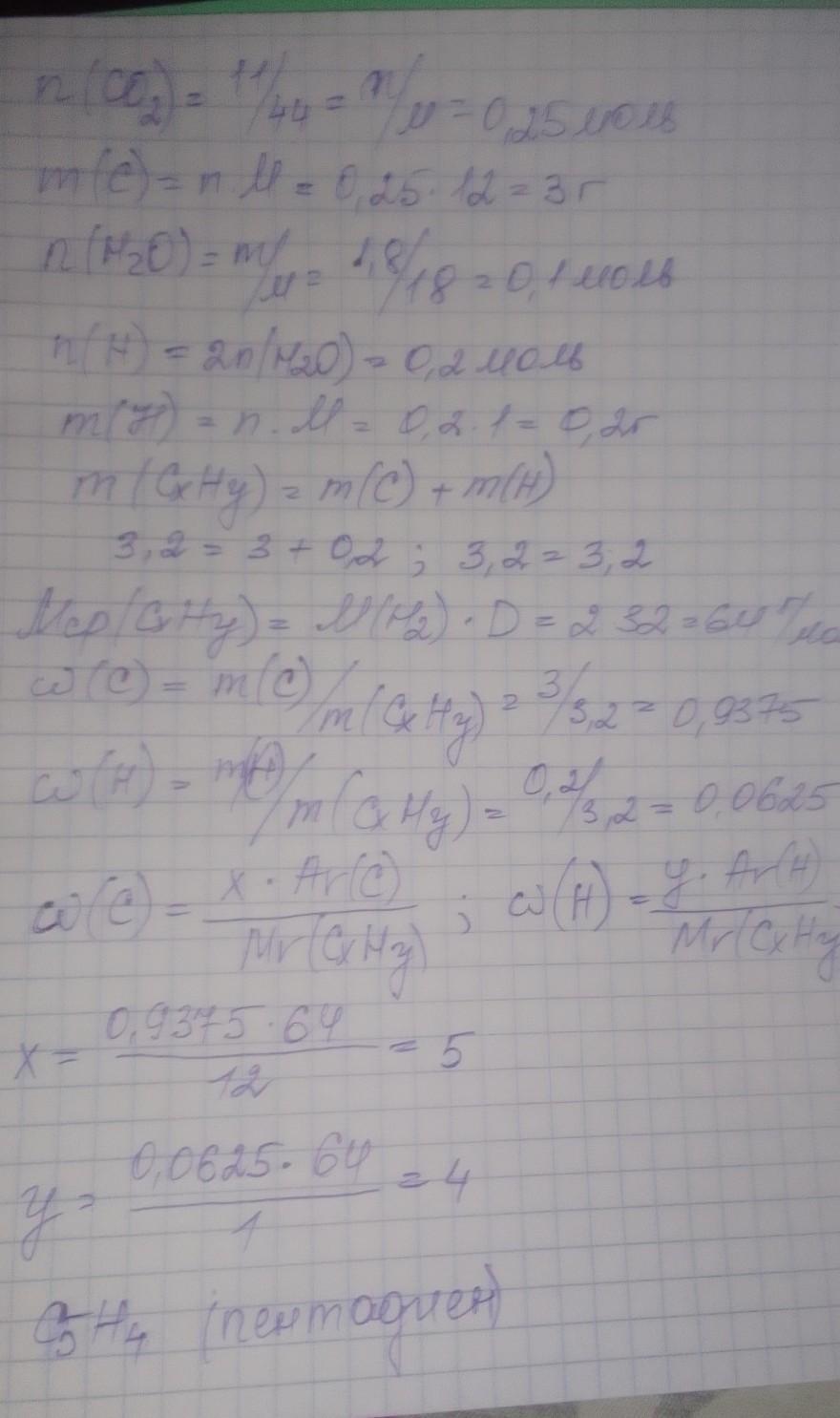 Помогите пж, задача не рашается, такое ощущение, будто в условии ошибка. 10. Выведите молекулярную формулу углеводорода, если при сжигании 3,2 г этого вещества образовались карбон (IV) оксид массой 11 г и вода массой 1,8 г. Относительная плотность пара вещества по водороду равна 32.