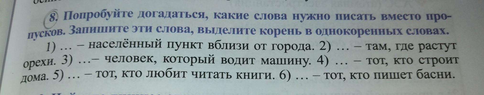 8) Попробуйте догадаться, какие слова нужно писать вместо про- пусков. Запишите эти слова, выделите корень в однокоренных словах. населённый пункт вблизи от города. 2) ... — там, где растут человек, который водит машину. 4) — тот, кто строит дома. 5)... — тот, кто любит читать книги. 6) ... – тот, кто пишет басни. 1)... орехи. 3) .