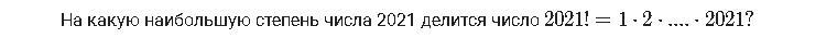 На какую наибольшую степень числа 2021 делится число 2021! = 1\cdot 2\cdot ....\cdot 2021?2021!=1⋅2⋅....⋅2021?