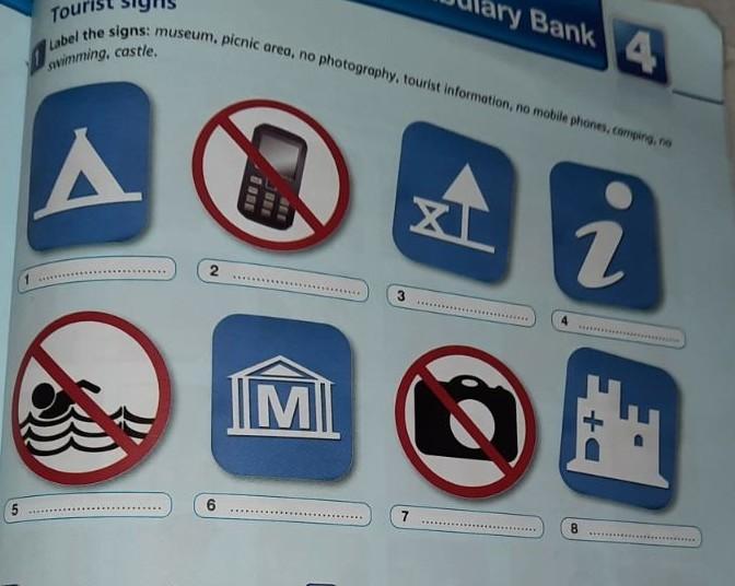 1. camping, 2. no mobile phone, 3. picnik area, 4. tourist information, 5. no swimming, 6. museum, 7. no photographs, 8. castle