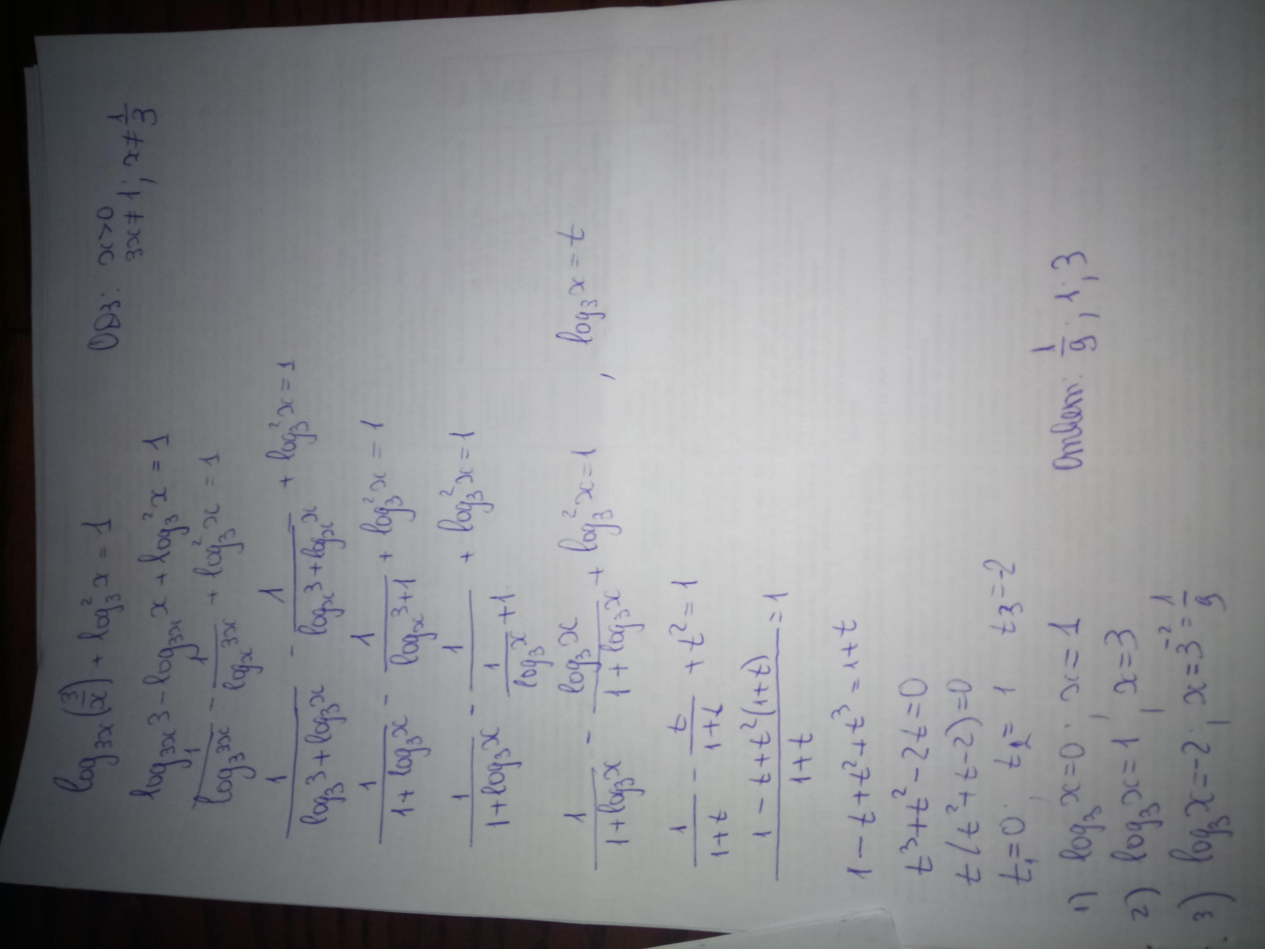 Можно еще так как вариант: Log(3x; 3/x) + log^2(3,x) = ln(3/x)/ln(3x) + log^2(3,x) = (ln3 - ln(x))/(ln3 + ln(x) ) + log^2(3,x) = (1 + ln(x)/ln(3) )/( 1 - ln(x)/ln(3) ) = (1+log(3,x) )/( 1 - log(3,x)) + log^2(3,x). (1-t)/(1+t) + t^2 = 1