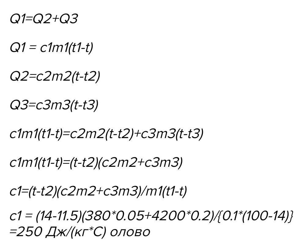 В алюмінієвий калориметр масою 50 г, в якому міститься 200 г води за температури 20 °С, опускають металеву кульку масою 400 г за температури 80 ºС. Теплова рівновага настала за температури 30 °С. Визначити питому теплоємність речовини кульки.