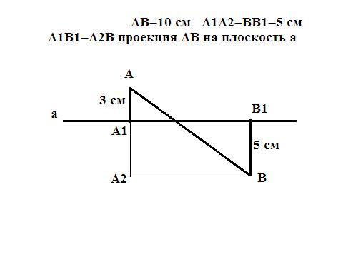 Проекция на плоскость равна катету прямоугольного треугольника с гипотенузой 10 см и с другим катетом (3+5)=8 см.