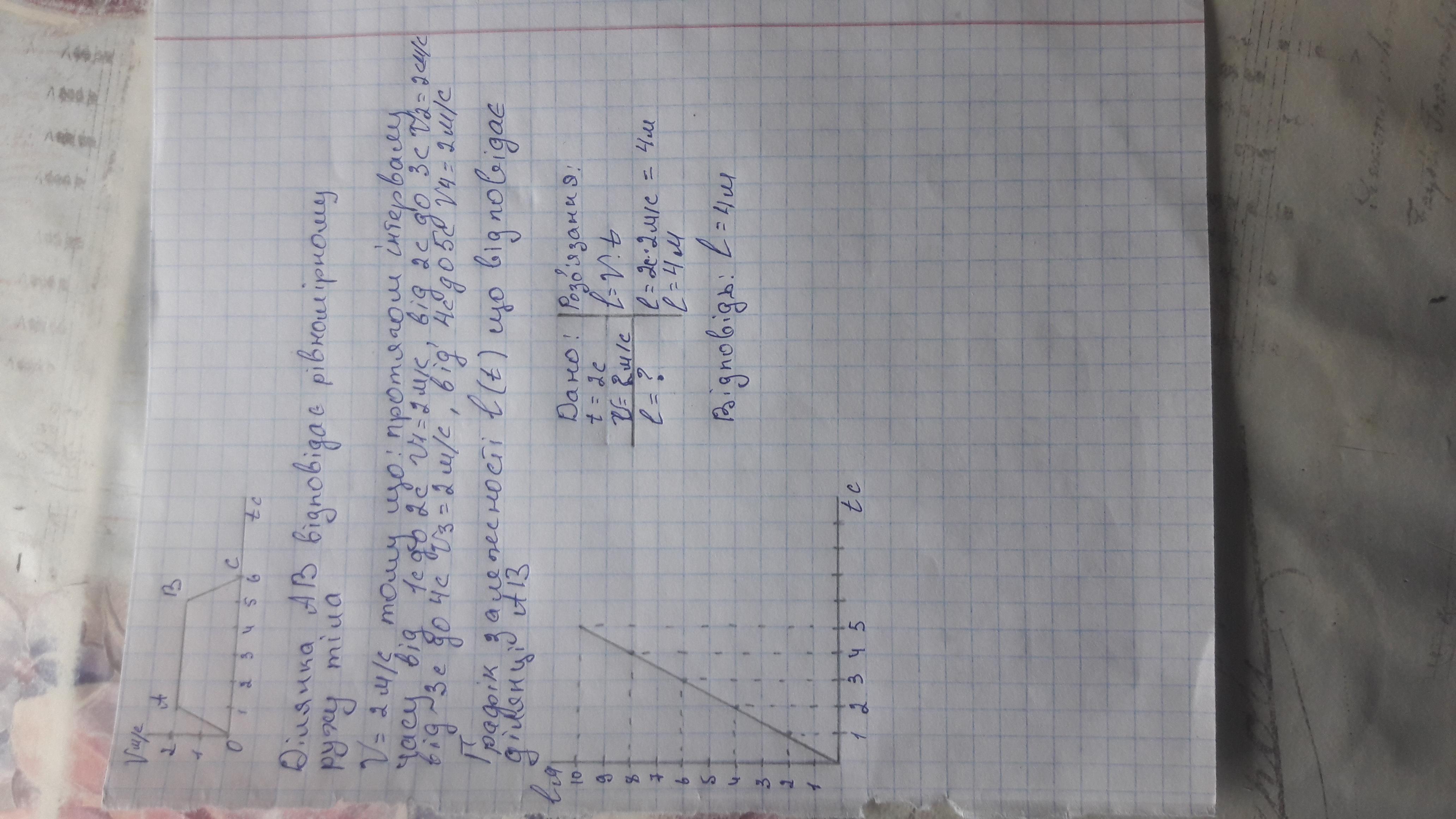 На графіку, поданому на рис. , виберіть ділянку, що відповідає рівномірному руху тіла, і визначте швидкість цього руху. Побудуйте графік залежності l(t), що відповідає цій ділянці, і визначте шлях, пройдений тілом за 2 с.