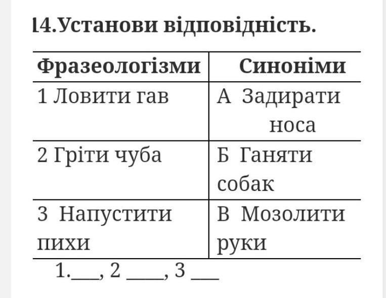 14.Установи відповідність. Фразеологізми 1 Ловити гав 2 Гріти чуба 3 Напустити пихи 1.___, 2 3 Синоніми А Задирати носа Б ганяти собак В МозолиТИ рукито