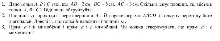 1. Дано точки Л, В и С таковы, что АВ - 2 см, ВС 5 см, АС- 3 см. Сколько существуют плоскостей, содержащих точки А, В i C ? Обоснуйте. 2. Плоскость а проходит через вершины А и D параллелограмма АВCD i точку О пересечения его диагопалей. Уточните, что точка В полежит плоскости а . 3. Прямые а и b скрещивающиеся и прямые а и с скрещивающиеся . Можно ли утверждать, что прямые скрещивающиеся?
