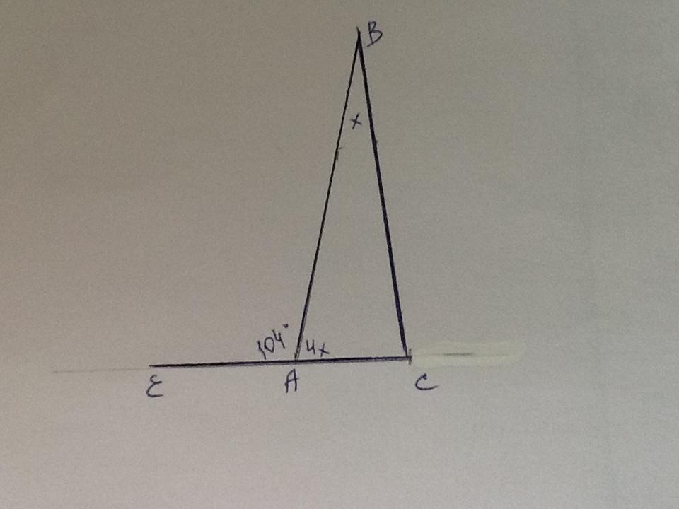 ∠ВАЕ=∠В+∠С; 104=х+(180-5х); 104=180-4х; 4х=74; х=19.