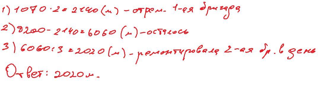 “Дві бригади ремонтували дорогу завдовжки 8 км 200 м. Перша бригада працювала два дні, ремонтуючи кожного дня по 1 км 70 м. Решту дороги відремонтувала друга бригада за 3 дні. Який шлях ремонтувала друга бригада за один день?”