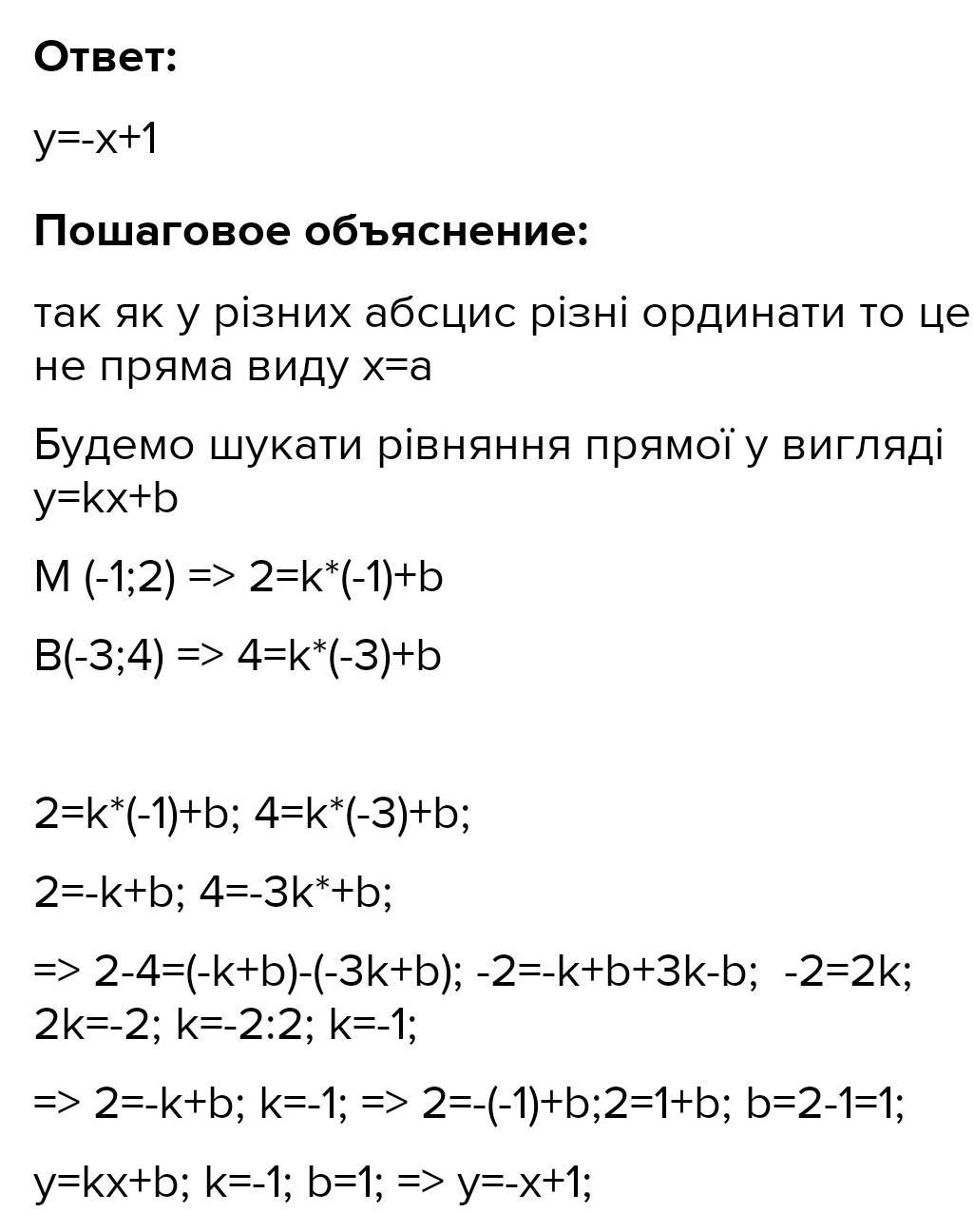 записати рівняння прямої що проходить через точки М (-1;4) B (1;3)