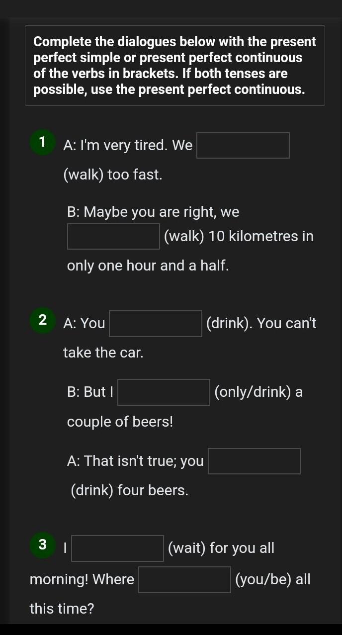Complete the dialogues below with the present perfect simple or present perfect continuous of the verbs in brackets. If both tenses are possible, use the present perfect continuous.