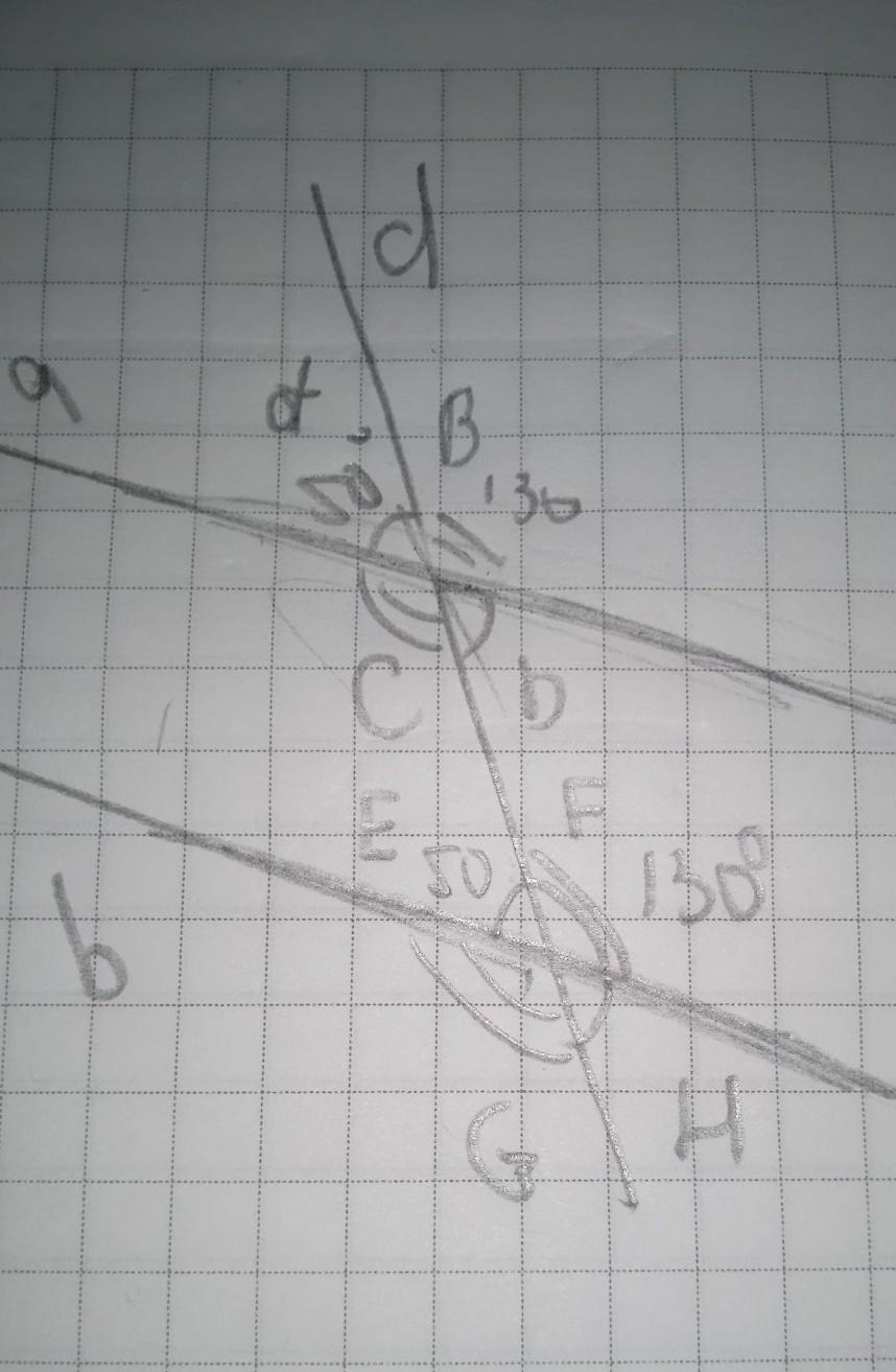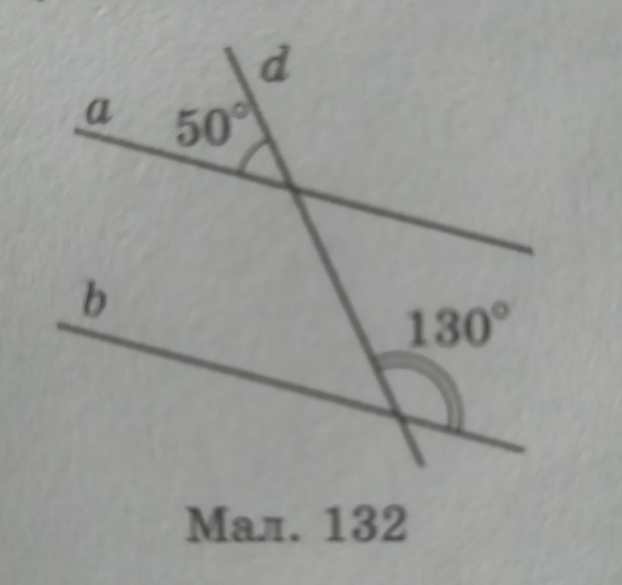 На малюнку 132 позначено міри двох кутів, що утворилися при перетині прямих a і b січною d. Обчисли міри всіх інших кутів, що утворилися. Чи паралельні прямі a і d