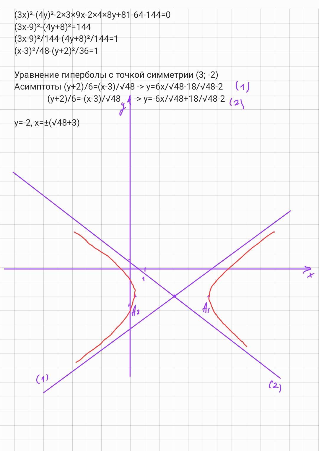 Уравнение гиперболы с точкой симметрии (3; -2)