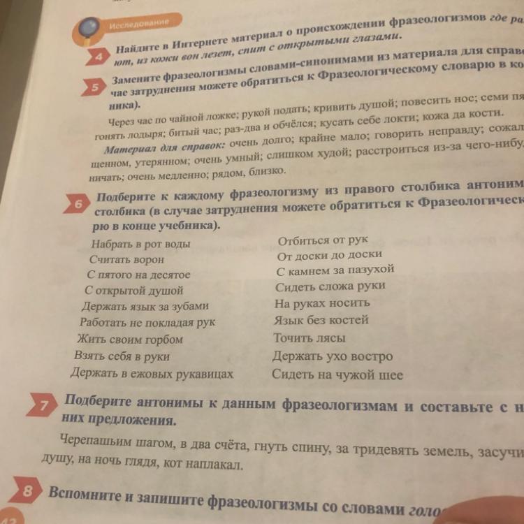 Подберите к каждому фразеологизму из правого столбика антоним из левого столбика